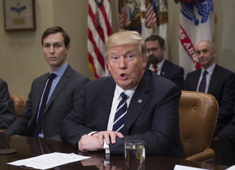 President Donald Trump speaks next to Jared Kushner, his senior advisor and son-in-law, in the White House on 31 January. Kushner’s family foundation is among several defendants named in a lawsuit over the financing of Israeli settlements and violent extremism.